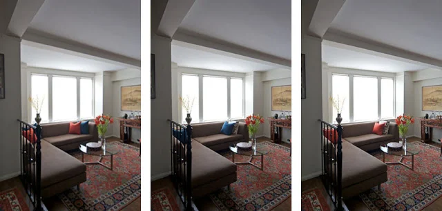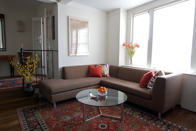A sectional sofa designed to a align with walls and level changes of the existing space.